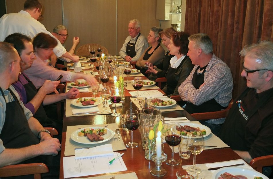 Samen koken en eten. Groepen van 8 tot 16 personen kunnen met ons koken onder begeleiding van een kok. In overleg wordt het menu samengesteld, waar natuurlijk met jullie wensen rekening gehouden wordt. Vers, streekgebonden en met respect voor het seizoen worden de ingrediënten zorgvuldig uitgezocht.